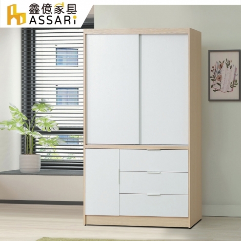 原木雙色4尺推門三抽衣櫃(寬122x深60x高202cm)