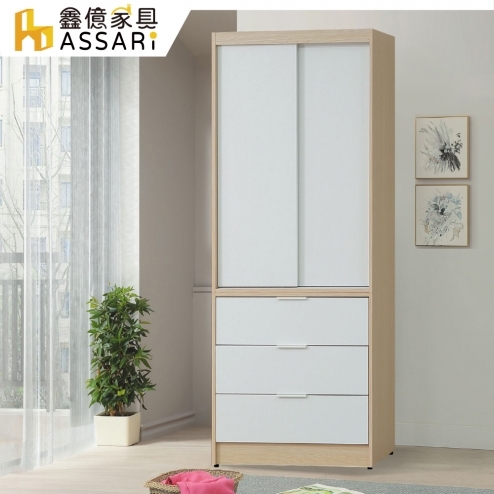 原木雙色2.7尺推門三抽衣櫃(寬81x深60x高202cm)